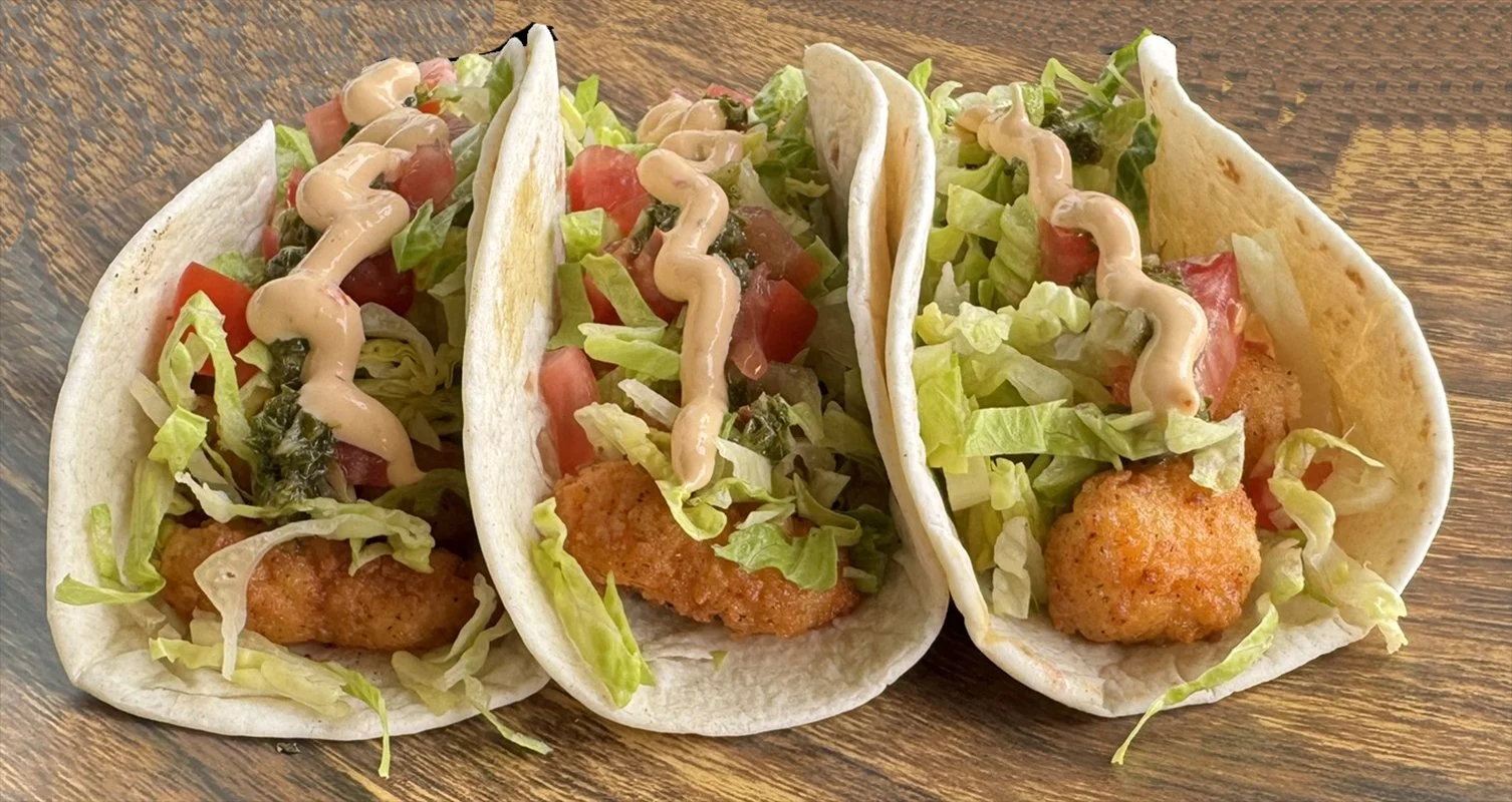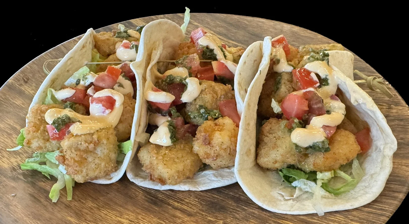Dive into the deliciousness of our Shrimp Tacos! We take three succulent Gulf shrimp tacos, lightly fry them in crispy panko, and serve them in warm flour tortillas. Piled high with fresh lettuce, ripe diced tomatoes, and drizzled with our vibrant homemade chimichurri and zesty chili aioli. Served with a side of our homemade fire-roasted tomato salsa. This taco is a burst of coastal flavors