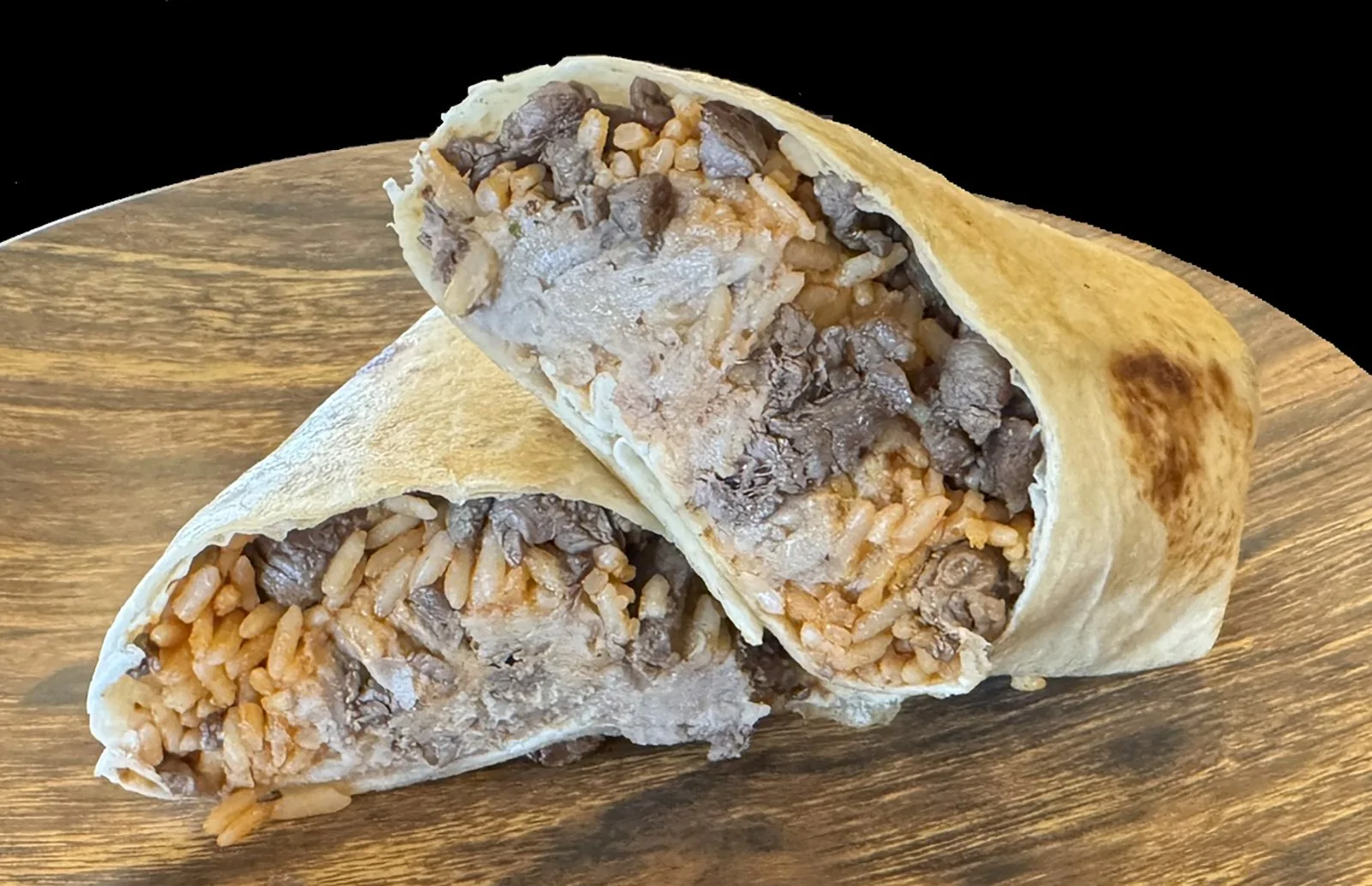 Indulge in our premium Steak Burrito, featuring perfectly seasoned, tender beef tenderloin, our signature homemade rice, and hearty beans. All these delicious ingredients are wrapped in a soft flour tortilla, then grilled on the flattop until beautifully golden brown. It’s a rich, satisfying, and perfectly seared meal, served with a side of our homemade fire-roasted tomato salsa.