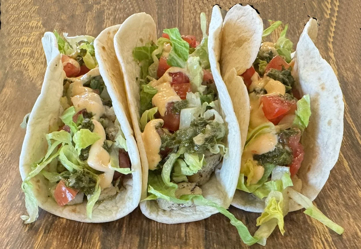 A classic favorite bursting with flavor! Our Chicken Tacos feature three perfectly seasoned chicken tacos nestled in soft flour tortillas. We then load them with crisp lettuce, fresh diced tomatoes, and a drizzle of our vibrant homemade chimichurri and zesty chili aioli sauce. Served with a side of our homemade fire-roasted tomato salsa. It's a fresh and satisfying bite every time!