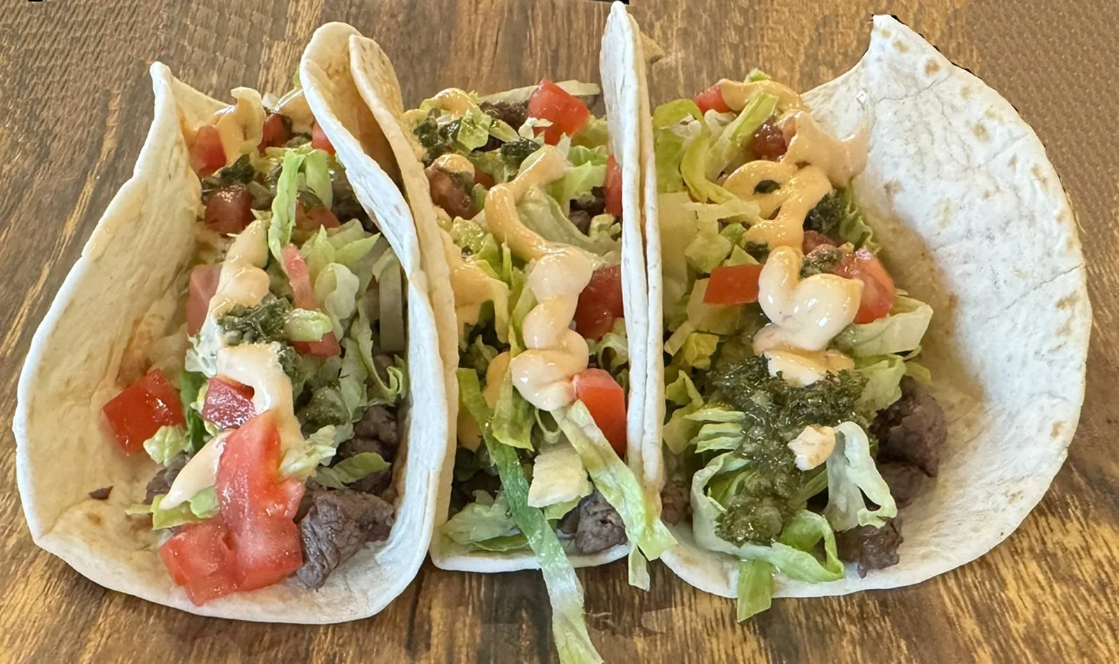 Get ready for a premium taco experience! Our Steak Tacos feature three perfectly seasoned, tenderloin steak tacos in soft flour tortillas, piled high with crisp lettuce, fresh diced tomatoes, and drizzled with our vibrant homemade chimichurri and zesty chili aioli. Served with a side of our homemade fire-roasted tomato salsa. It's a rich, flavorful, and incredibly satisfying bite!